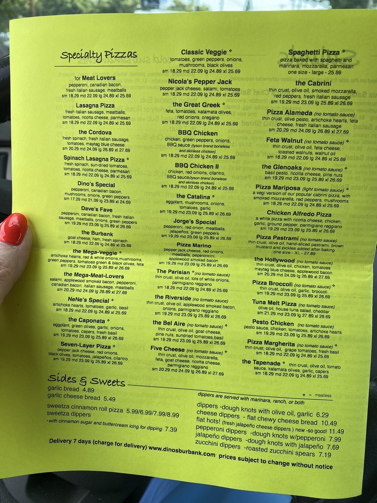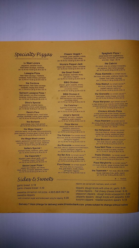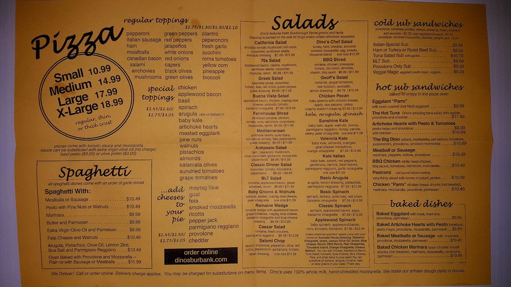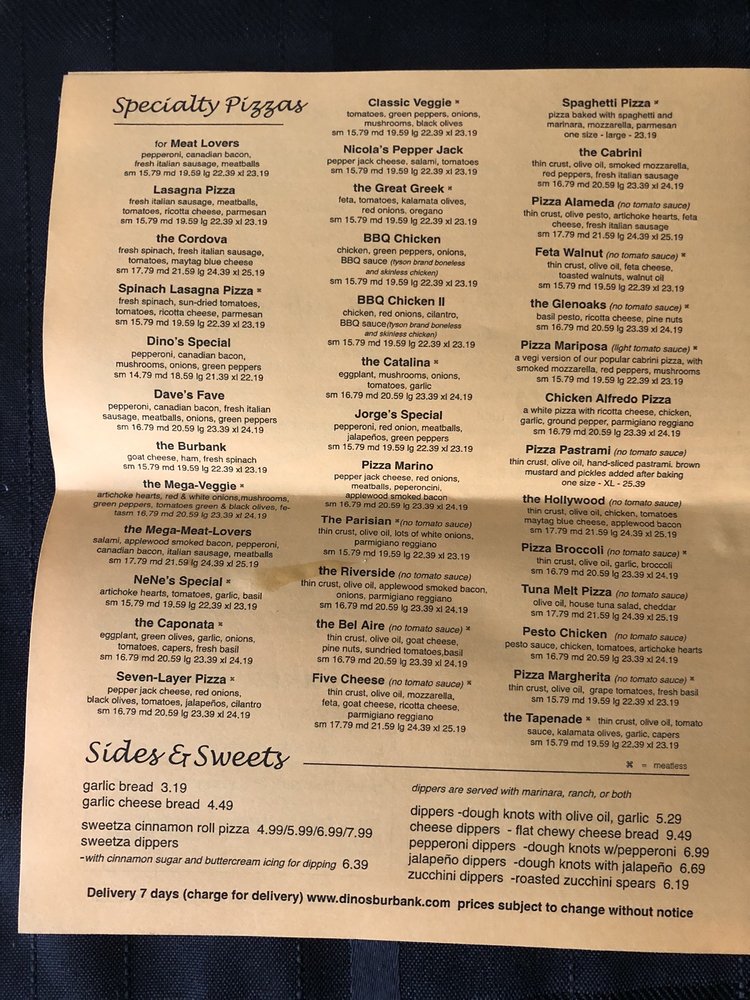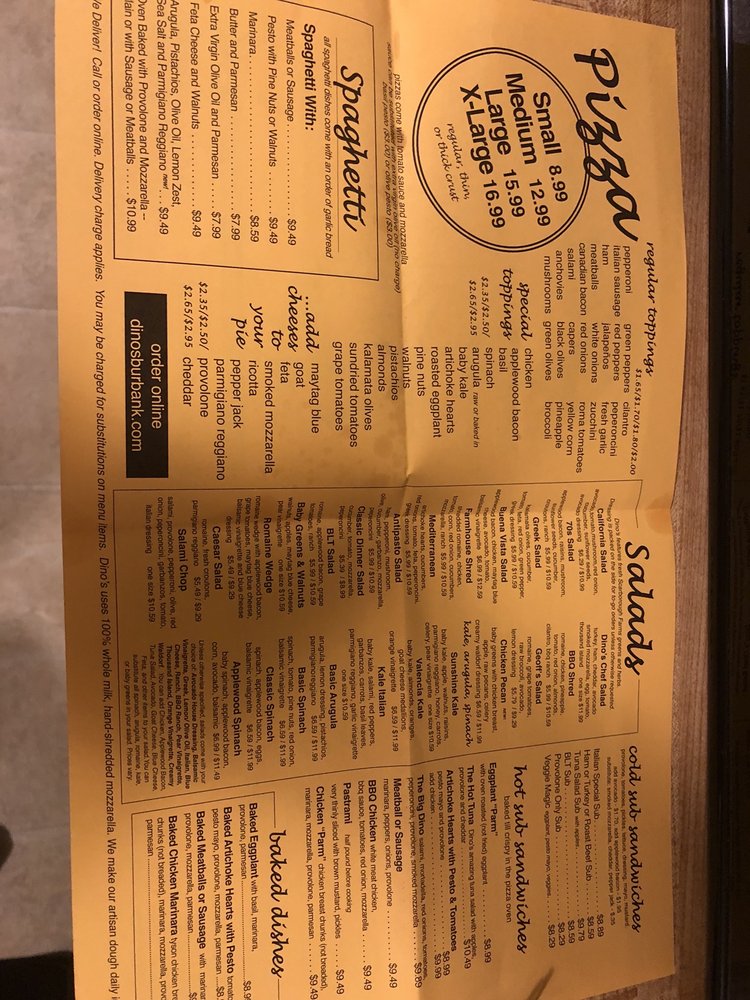 At Dino's Pizza, located in Burbank, CA, you can indulge in a variety of delicious options such as cheese pizzas with regular and gourmet toppings, specialty pizzas like the Caponata and Cordova, and fresh salads like the California and Greek. The cozy dine-in area offers a friendly atmosphere, perfect for enjoying their homemade and fresh pizza dough that delivers a perfect blend of crunch and chew in every bite. Customers rave about the Spaghetti and Lasagna pizzas, highlighting the quality of the food and the attentive service. With amenities like air conditioning, friendly staff, and a casual ambiance, Dino's Pizza provides a memorable dining experience that's worth coming back for.