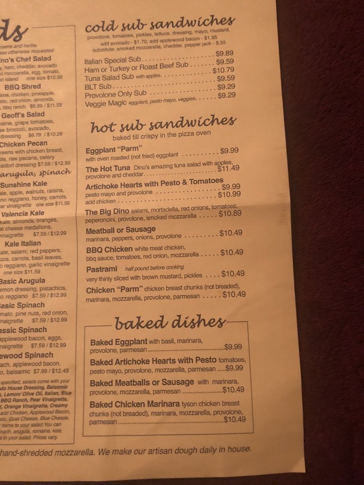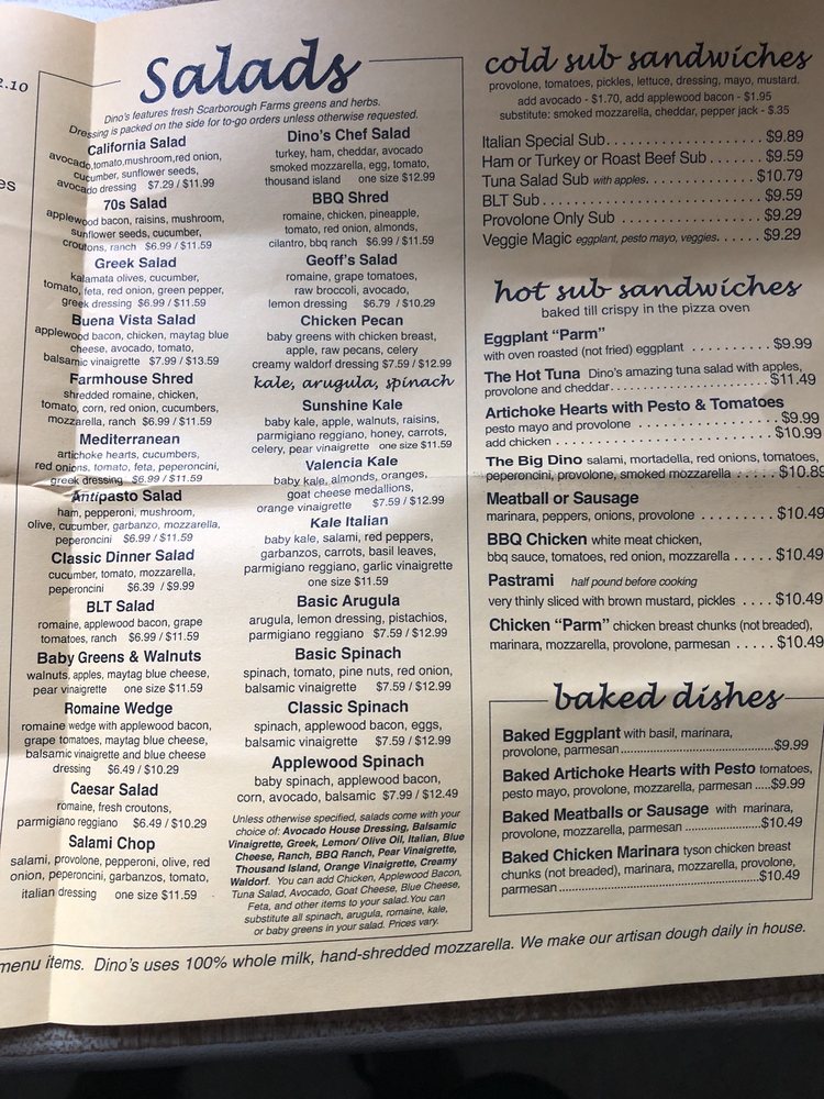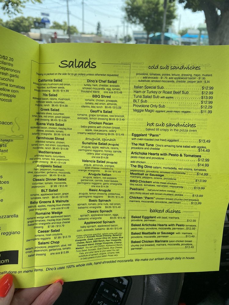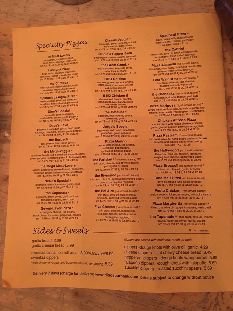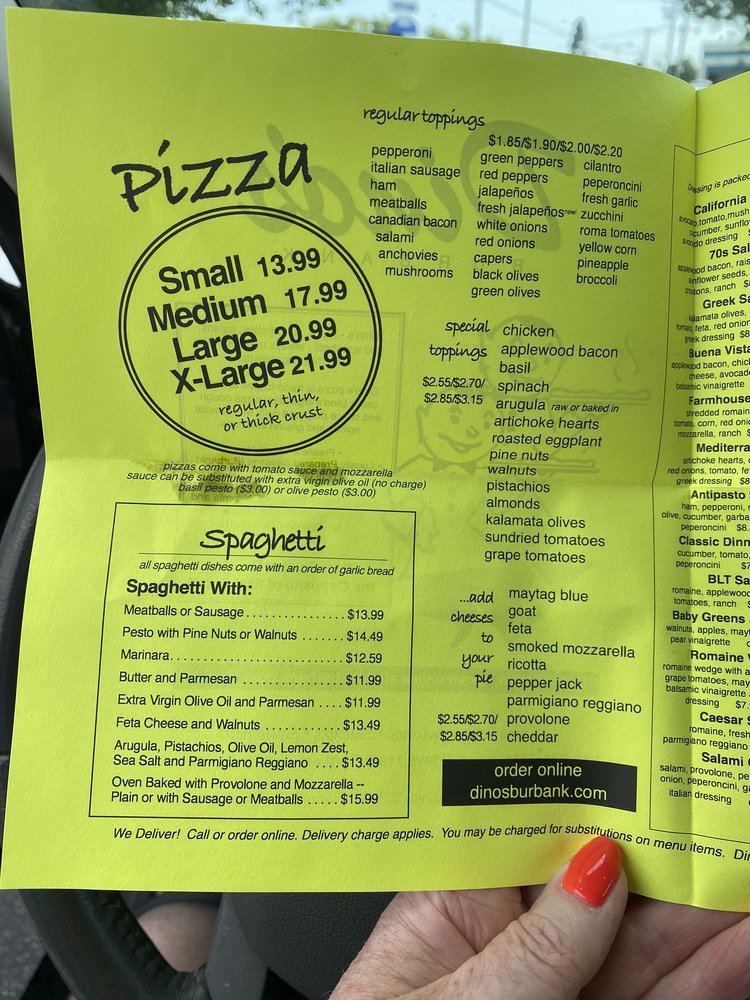At Dino's Pizza, located in Burbank, CA, you can indulge in a variety of delicious options such as cheese pizzas with regular and gourmet toppings, specialty pizzas like the Caponata and Cordova, and fresh salads like the California and Greek. The cozy dine-in area offers a friendly atmosphere, perfect for enjoying their homemade and fresh pizza dough that delivers a perfect blend of crunch and chew in every bite. Customers rave about the Spaghetti and Lasagna pizzas, highlighting the quality of the food and the attentive service. With amenities like air conditioning, friendly staff, and a casual ambiance, Dino's Pizza provides a memorable dining experience that's worth coming back for.