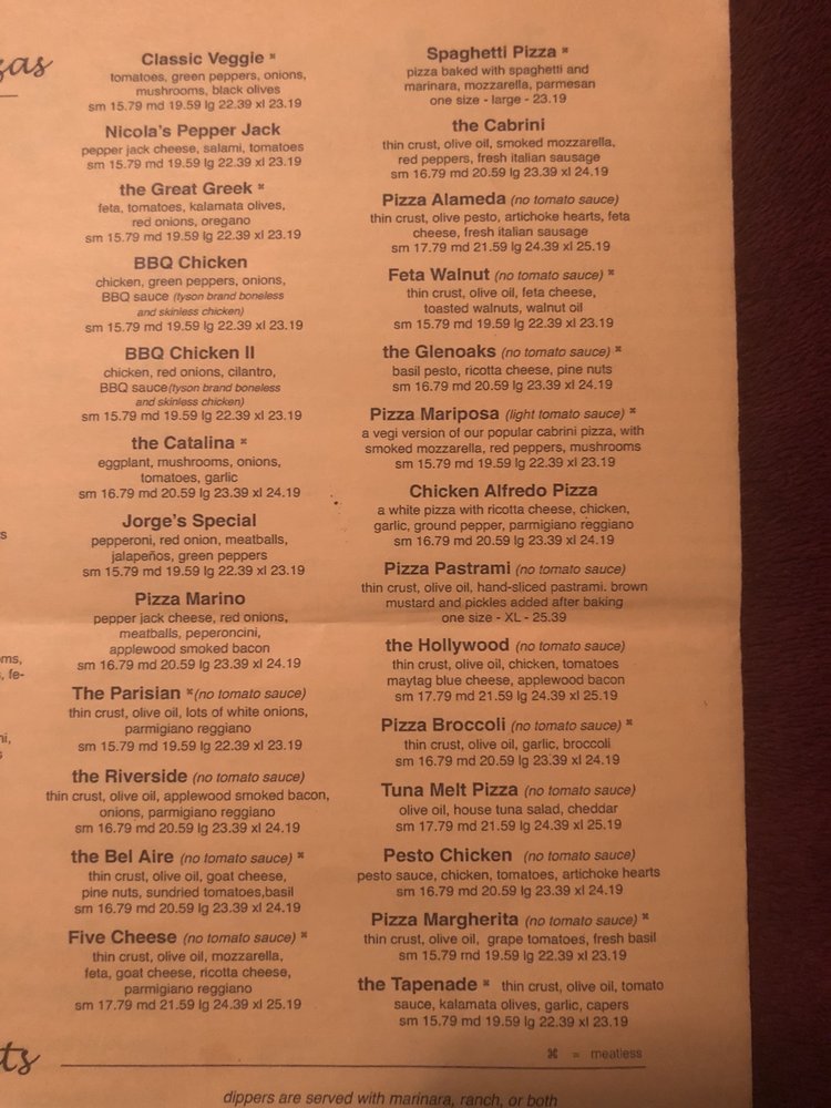 Thin crust pizza with olive oil, tomato sauce, Kalamata olives, garlic and capers. Meatless.